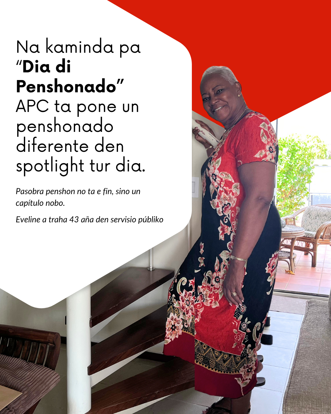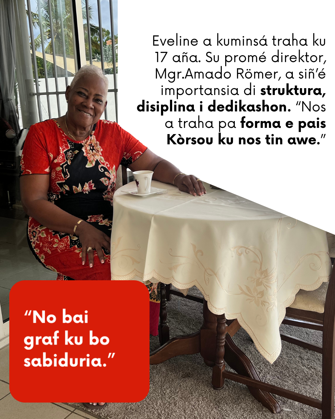 Eveline Ignecia (73) a traha 43 aña den servisio públiko, i awor ku e ta ku penshon, e ta mesun aktivo ku semper. Durante pandemia di COVID, el a bolbe traha pa un ratu pa asistí SOAW ku hende ku a pèrdè nan trabou. E ta boluntario pa WoMen Steering Committee Curaçao, parokia di Brievengat i Fundashon Pro Bista. “Komo hende, nos tin e obligashon di pasa nos sabiduria pa e siguiente generashon,” e ta bisa. “Pa nos tur por tin un bida mihó.” E aktitut aki ta bria den tur kos ku e ta hasi.