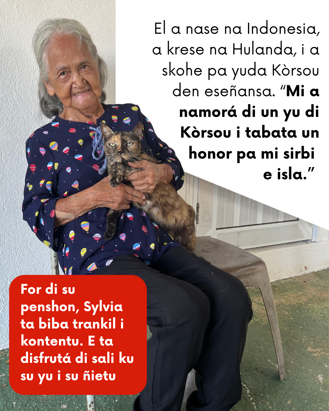 Sylvia Arrindell - van den Oever a pasa su karera den e sektor di edukashon. El a nase na Indonesia, a krese na Hulanda, i a skohe pa yuda Kòrsou den eseñansa. “Mi a namorá di un yu di Kòrsou i tabata un honor pa mi sirbi e isla. Den mi trabou , mi tabata duna èkstra atenshon na alumnonan ku tabata tin difikultat, ku siñamentu.
